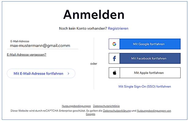 Für einen neuen Account müssen Sie sich bei Wix registrieren. Wix aufrufen