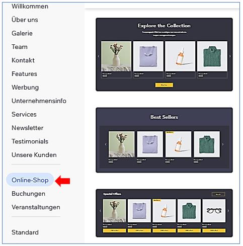 Um das Element "Online-Shop" zu einer Wix-Seite hinzuzufügen, können Sie die folgenden Schritte befolgen: