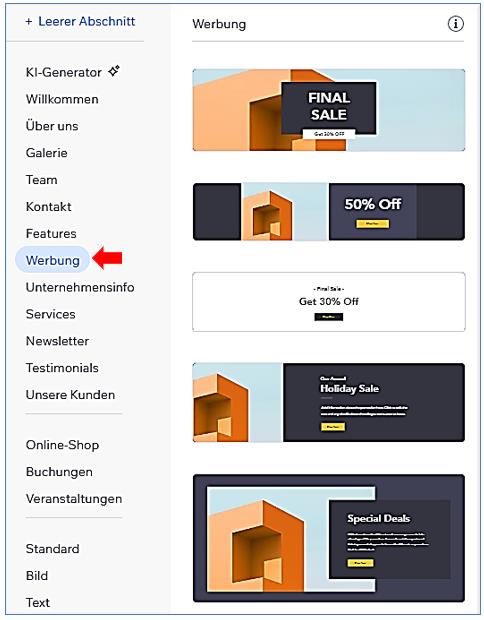 Fügen Sie einen Abschnitt hinzu, um Anzeigenbanner auf Ihrer Website zu platzieren. Sie können Werbeanzeigen von Drittanbietern einbinden oder Ihre eigenen Werbeaktionen bewerben. Verlinken Sie die Anzeigen mit relevanten Zielseiten, um Besucher auf bestimmte Produkte oder Angebote aufmerksam zu machen. -